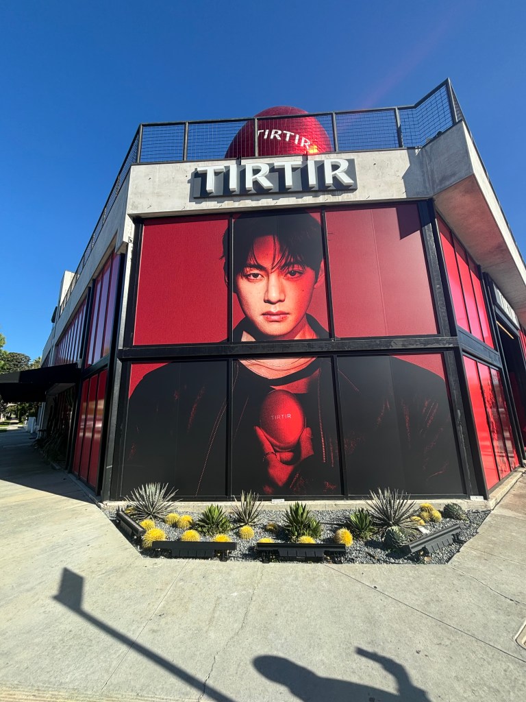 We went to the TIRTIR popup that is currently happening November 15th through the 23rd. Right away you are greeted with a huge photo of Kim Taehyung (aka V) and the huge cushion outside the TIRTIR building. Honestly, I loved it! I watched them build it through the time-lapse posted on the official Instagram. Shout out to all of the people building, creating concepts and designing!